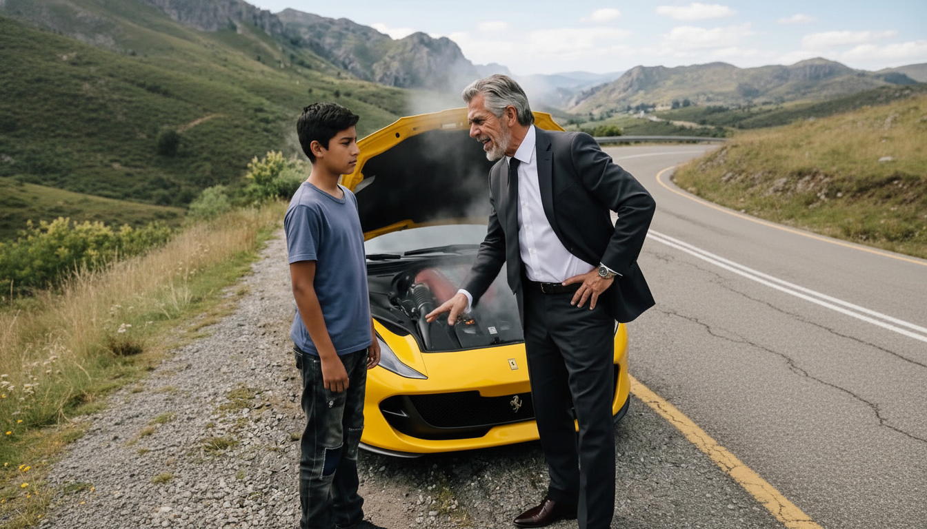 El sol de la tarde caía con furia sobre el asfalto de la carretera de montaña. Ricardo, un influyente empresario tecnológico, caminaba de un lado a otro junto a su flamante deportivo amarillo. El humo que salía del motor no solo representaba una avería mecánica, sino el fracaso de su mentalidad perfeccionista. Había gastado una fortuna en ese coche de lujo, confiando en que la ingeniería de vanguardia nunca le fallaría.