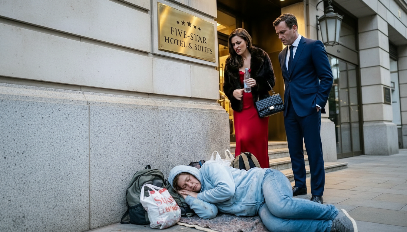 Esa tarde, al salir del lobby del brazo de su prometido, Julián, algo arruinó su perfecta vista. Una mujer con una sudadera desgastada y una mochila vieja dormía plácidamente en los escalones de la entrada. La reacción de Elena no fue de compasión, sino de una indignación clasista que no pudo contener.