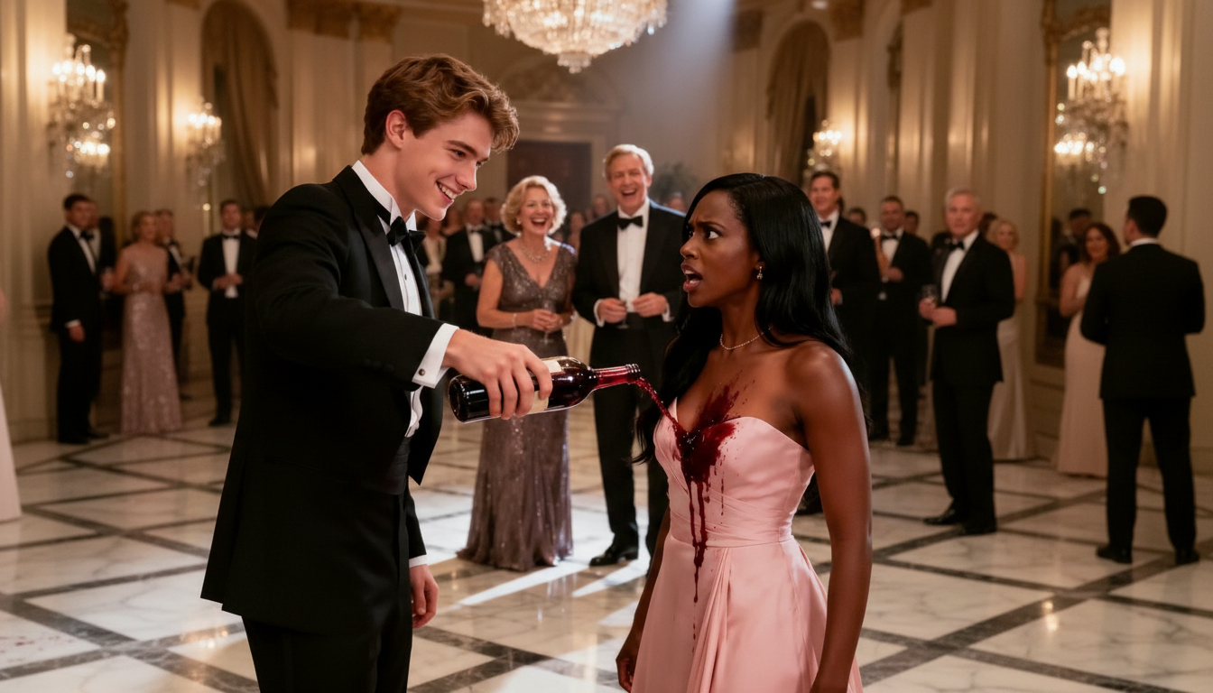 Sin mediar palabra, Julian se acercó con una sonrisa cínica y vació su copa de vino tinto sobre el vestido rosa de Elena. Las risas no se hicieron esperar. El racismo latente se manifestó en palabras hirientes: "Estás en el lugar equivocado", sentenció el joven, mientras su padre celebraba la "lección" que su hijo le estaba dando a la "mugrosa". La humillación era pública, pero Elena, manteniendo una dignidad inquebrantable, no derramó una sola lágrima.